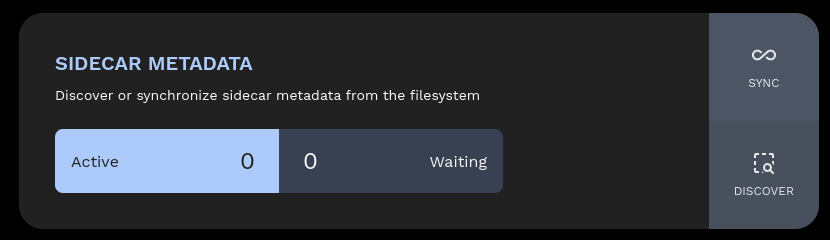There are 2 administrator jobs associated with sidecar files: SYNC and DISCOVER. The sync job will re-scan all media with existing sidecar files and queue them for a metadata refresh. This is a great use case when third-party applications are used to modify the metadata of media. The discover job will attempt to scan the filesystem for new sidecar files for all media that does not currently have a sidecar file associated with it.